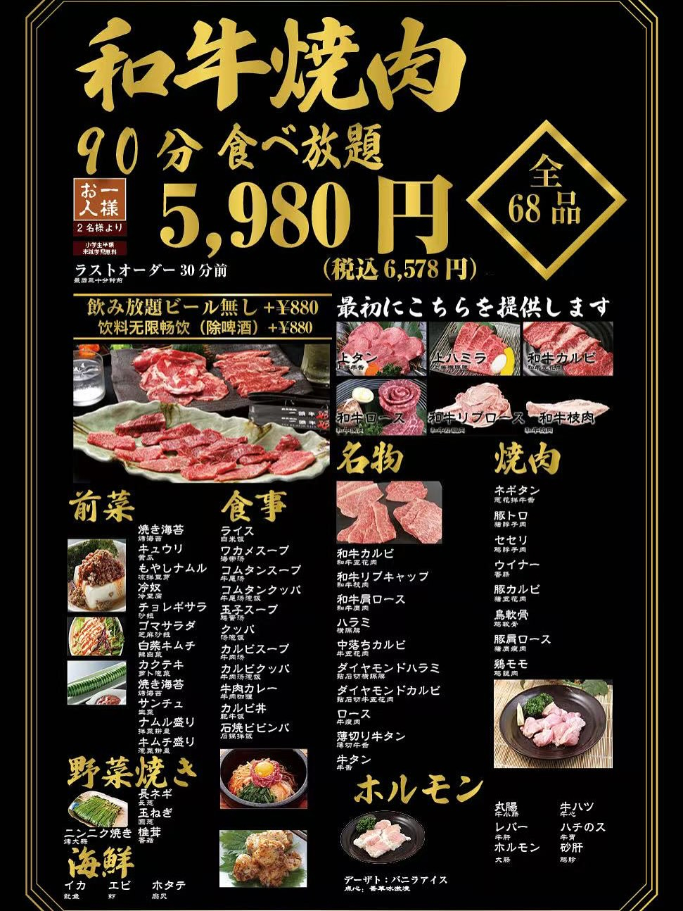 和牛スタンダード食べ放題、プラス880円飲み放題も追加可能和牛スタンダード食べ放題、プラス880円飲み放題も追加可能。
